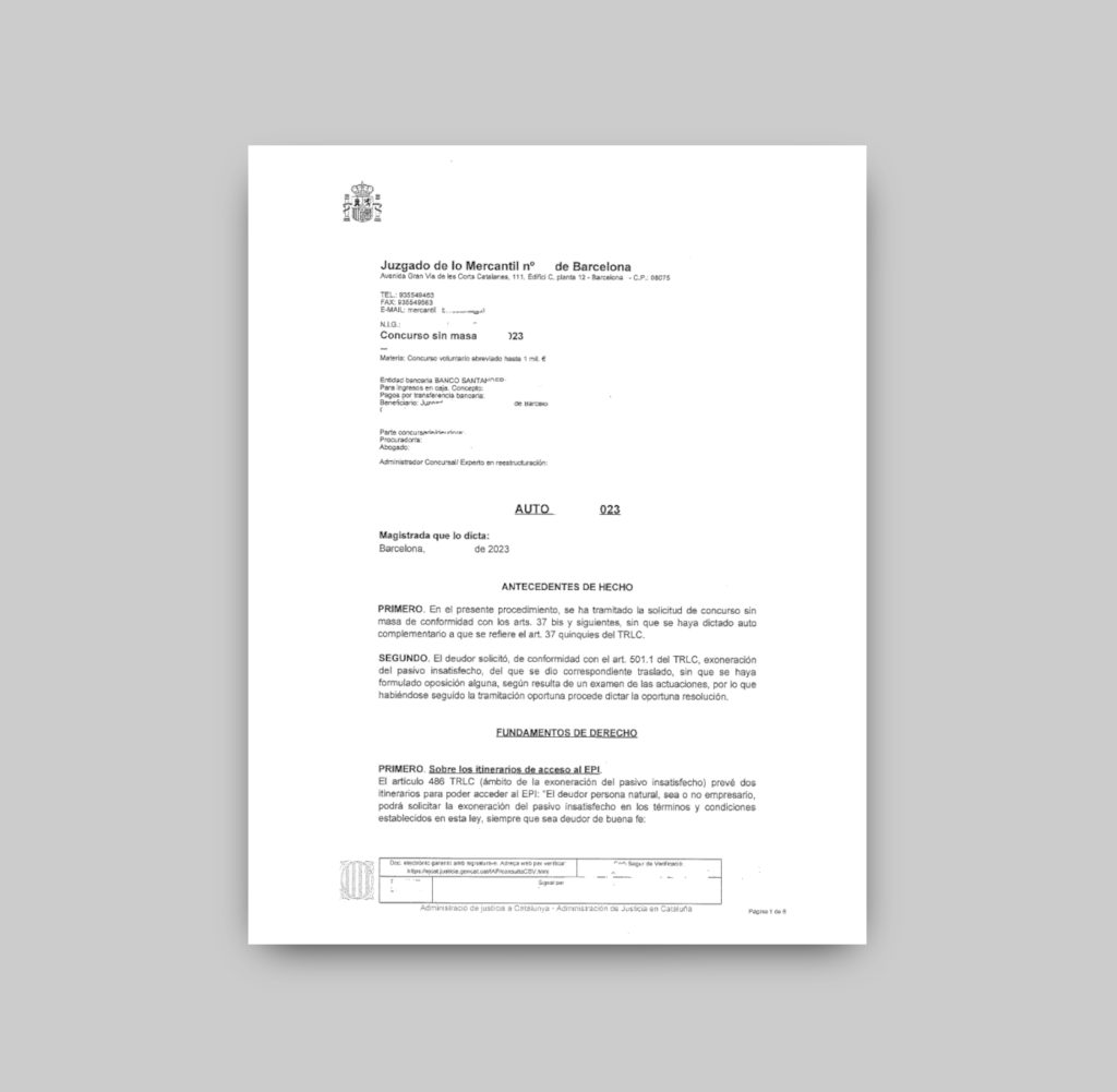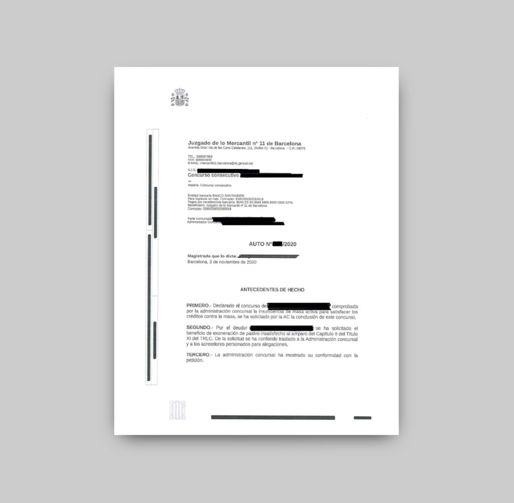 El Jutjat Mercantil nº 11 de Barcelona ha exonerat a un client deutes per import de 337.608,57 €, en els quals s’inclouen avals i deutes amb l’administració pública.